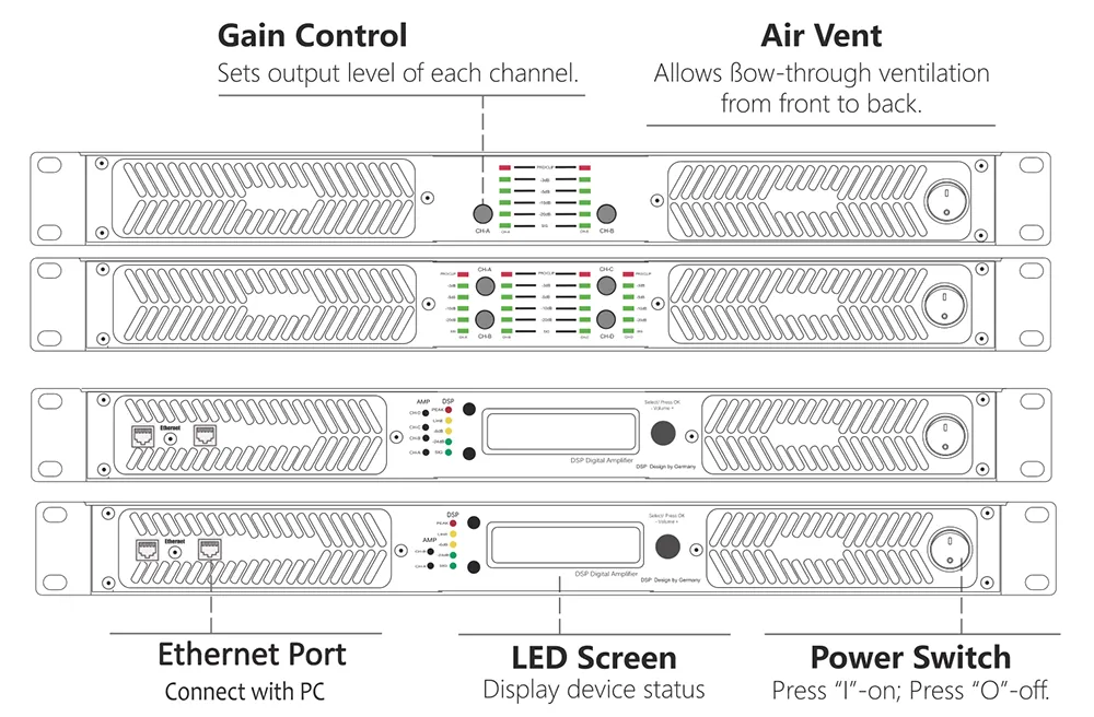 Model: D4-3500 Kanal: 4 kanal güç amplifikatörü Özellik: 1U/Dijital Amp/2 Ohm Kararlı Çıkış Gücü: 8Ω Stereo Güç (RMS): 3.500WX 4CH 4Ω Stereo Güç (RMS): 5.000WX 4CH 2Ω Stereo Güç (RMS): 6.600WX 4CH