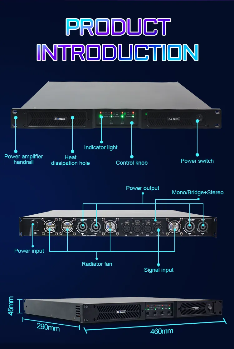 | Dijital Amplifikatör K4-1400 Özellik: 1. Sınıf D güç amplifikatörü modülü kullanın. Benzersiz tepe kesme sınırlayıcı ve dalgalanma azaltma. 2. Mükemmel koruma sistemi, uygunsuz kullanımdan kaynaklanan kayıpları etkili bir şekilde azaltır. 3. Mükemmel devre tasarımı bası güçlü ve kuvvetli hale getirir ve orta ve yüksek frekanslar şeffaf ve nettir. 4. 1U tasarımı, hafif ve çok küçük alan kaplama oranı. 5. Büyük ve orta ölçekli barlarda, ziyafet salonlarında ve açık hava performanslarında yaygın olarak kullanılır. |