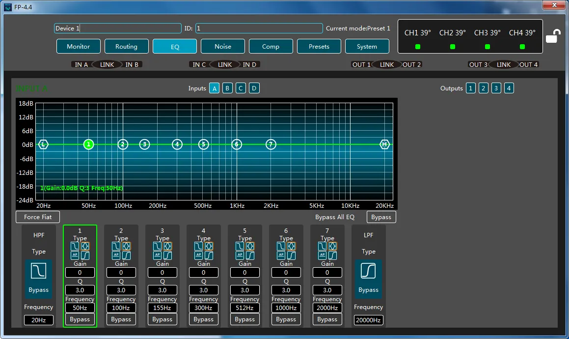 | 12. | Tüm 4 giriş, -15dB ile +15dB arasında ayar aralığına sahip 7 bağımsız parametrik ekolayzır içerir; ekolayzır modları PEQ, LF, HP, ALLPASS olarak seçilebilir; giriş yapılandırması sınırlayıcılar, gürültü kapıları, gecikme, faz, yüksek geçiş, düşük geçiş, giriş kalibrasyonu, kanal parametresi kopyalama, sessize alma ve diğer işlevleri içerir. |